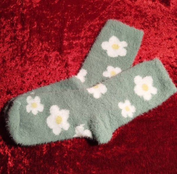 Enveloppez vos pieds de douceur et de légèreté grâce à ces jolies chaussettes bleues ou vertes au motif de fleurs, toutes douces et moelleuses.